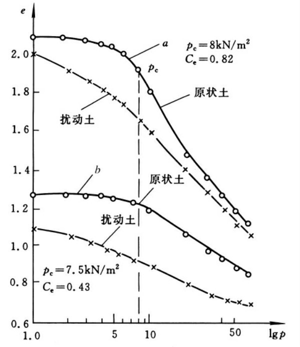 在3.2节土的压缩试验中,已讲述过压缩试验成果可用e-lgp曲线表示。图3-12表示的是两个土样的原状和扰动后的e-lgp曲线,很明显,原状土的应力-应变曲线可以分为两段:当压力较小时,曲线接近于水平线;当压力较大时,则成为向下斜的另一条直线。而扰动土没有这样的性质。习惯上,把e-lgp曲线的转折点所对应的压力称为“前期固结压力”,用pc表示。