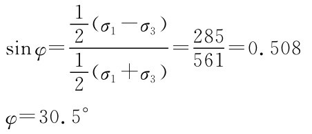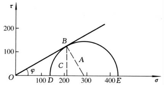 作应力圆A,如图4-21所示。过O点作A圆的切线,即为抗剪强度线。于是有: