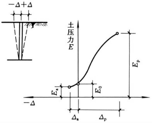 实际上,土压力是土体与挡土结构之间相互作用的结果,大部分情况下的土压力均介于上述三种极限状态土压力之间。试验结果表明,土压力的大小及分布与作用在挡土结构上的土体性质、挡土结构本身的材料及挡土结构的位移有关,其中挡土结构的位移情况是影响土压力性质的关链因素。图5-3表示的是上述三种土压力与挡土墙位移的关系。从图中可看出,产生被动土压力所需要的位移Δp比产生主动土压力所需的位移Δa要大得多。在相同条件下,主动土压力Ea小于静止土压力E0,而静止土压力E0又小于被动土压力Ep,即