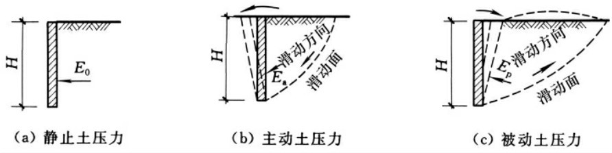 根据挡土结构物的位移和墙后填土所处的状态,土压力可分为静止土压力、主动土压力和被动土压力三种,如图5-2所示。