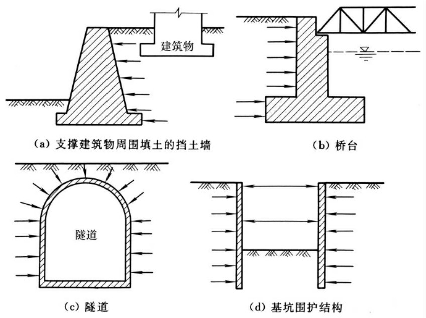 在建筑、水利、道路、桥梁工程中,为了防止土体滑坡和坍塌,经常要修建各种各样的挡土结构物,如挡土墙、桥台、隧道和基坑围护结构(图5-1)等,这些挡土结构物承受着土体侧压力的作用,土压力就是这种侧压力的总称。