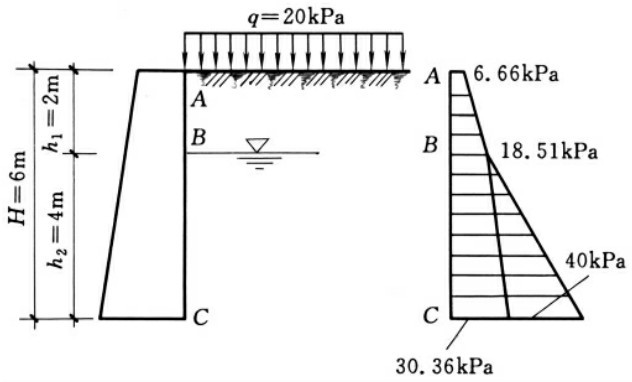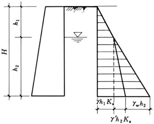 在挡土墙背后的填土中,常会遇到全部或部分被水淹没的情况,此时作用于墙背的土压力将有所不同。墙除受到土压力作用外,还受到水压力的作用。