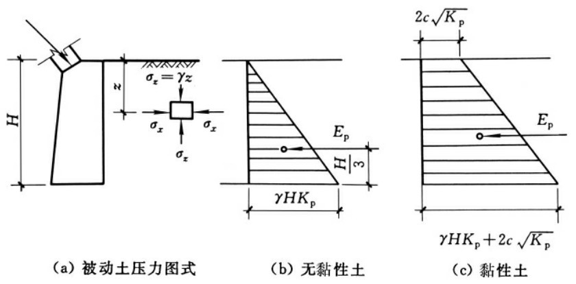 被动土压力Ep的作用方向垂直于墙背,作用点位于三角形或梯形压力分布图的形心上,形心位置可通过一次取矩求得。