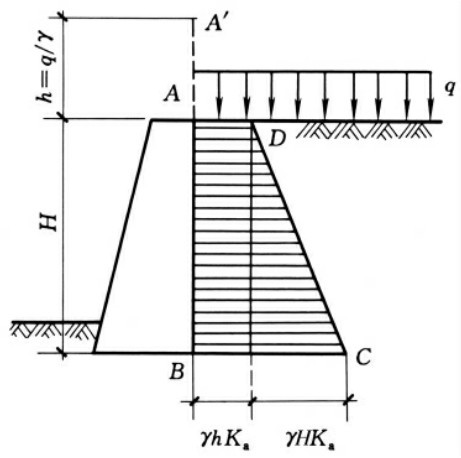 当挡土墙后填土表面有均布荷载q作用时,土压力的计算方法是将均布荷载换算成当量的填土重,即用假想的土重代替均布荷载。如填土水平,墙背竖直、光滑(图5-8),这时适宜采用朗金土压力公式,当量土层厚度为