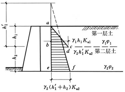 ,然后以(h′1+h2)为墙高计算第二层土压力,但只在第二层土层厚度范围内有效,如图5-9中的bdfe部分。因此,在土层的分界面上,土压力的计算值会出现两个数值,其中一个代表第一层底面的压力,而另一个则代表第二层的压力。同时,要注意,土层性质不同,土压力系数Ka也不同,计算第一层土压力时,应采用第一层土的指标算得的Ka1,计算第二层土压力时,则应采用第二层土的指标算得的Ka2。当多层土时,计算方法也相同。