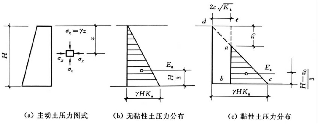 ,墙后土压力是这两部分叠加的结果,如图5-5(c)所示,其中的ade部分为负侧压力,对墙背是拉力,但实际上墙与土在很小的拉应力作用下就会分离,在拉力区范围内的土将会出现裂缝,故在计算土压力时,这部分应略去不计,因此黏性土的土压力分布实际上仅是abc部分。