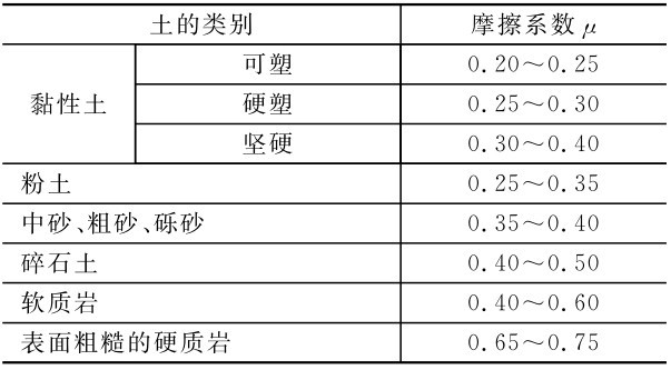 注: ①易风化的软质岩和塑性指数Ip>22的黏性土,基底摩擦系数应通过试验确定。