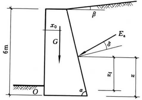 求出自重G的重心距离墙趾O点的距离x0=2.86m,土压力水平分力的力臂zf=z=2m,土压力垂直分力力臂为xf=b-zcotα=3.65m,按式(6-18)验算抗倾覆稳定性如下: