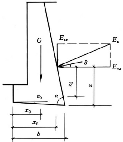对重力式挡土墙进行计算,首要的问题是确定作用在挡土墙上有哪些力,其中的关链是确定作用在挡土墙上的土压力的性质、大小、方向与作用点。在力的作用下要求重力式挡土墙不产生滑移和倾覆而保持稳定状态。作用在重力式挡土墙上的力主要有土压力、墙体自重、基底反力,这是作用在重力式挡土墙上的基本荷载。如果墙背后的排水条件不好,有积水时,还应考虑静水压力的作用;如果在重力式挡土墙的填土表面上有堆放物或建筑物等,还应考虑附加荷载;在地震区还需考虑地震力的附加作用力。