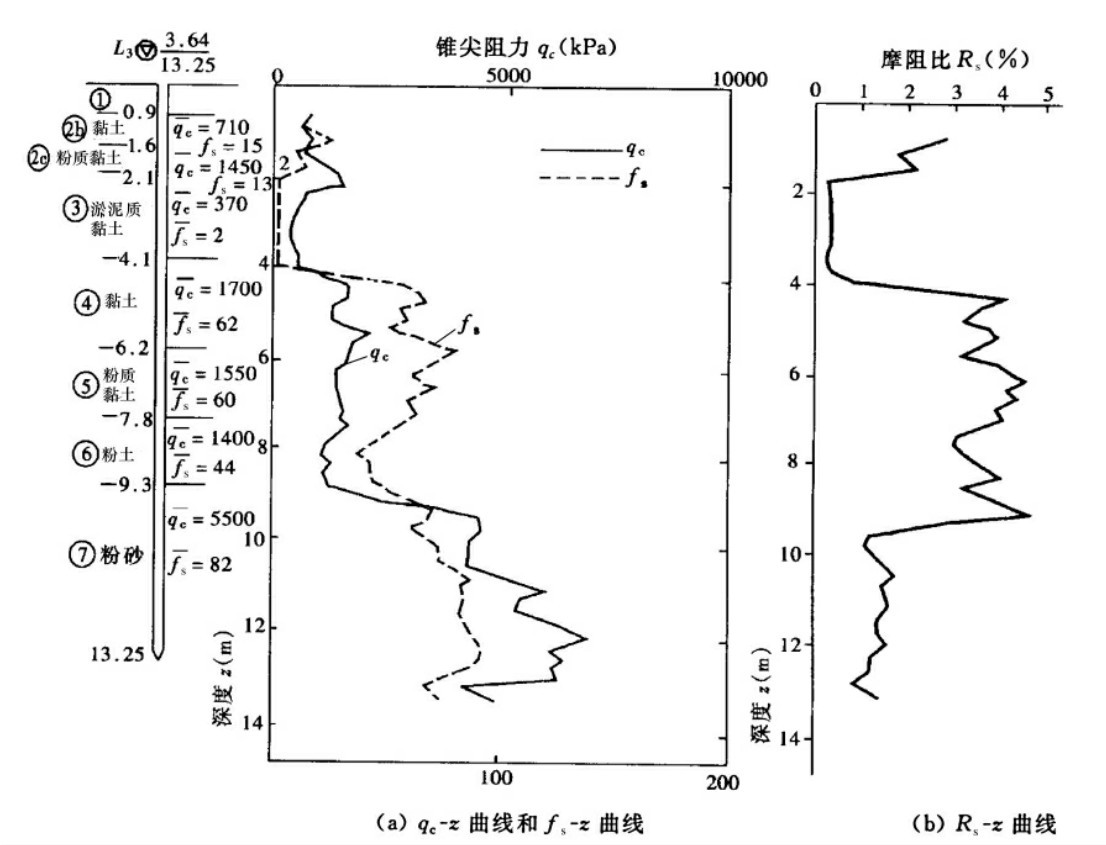为了直观反映勘探深度范围内土层的性质,可绘制比贯入阻力ps与深度z的关系曲线、侧壁摩阻力fs与深度z的关系曲线、摩阻比Rs与深度z的关系曲线等,图7-2给出了用双桥探头测得的有关曲线。