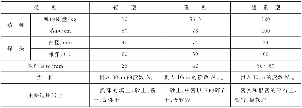 圆锥动力触探试验的类型可分为轻型、重型和超重型三种,其规格和适用土类应符合表7-7的规定。