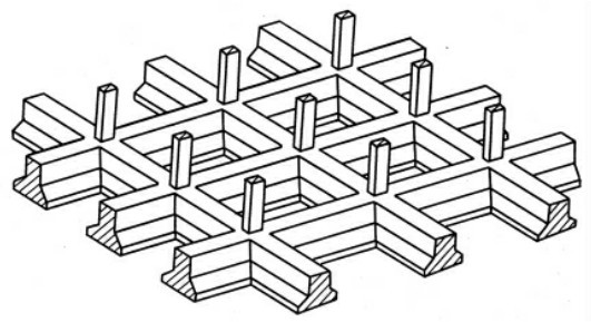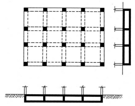 当单向条形基础的底面积仍不能承受上部结构荷载的作用时,可把纵横柱的基础均连在一起,从而成为十字交叉条形基础,如图8-5所示。十字交叉条形基础具有较大的整体刚度,在多层厂房、荷载较大的多层及高层框架结构基础中常被采用。