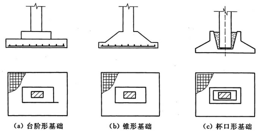 柱下钢筋混凝土独立基础通常有现浇台阶形基础、现浇锥形基础和预制柱的杯口形基础,如图8-2所示。