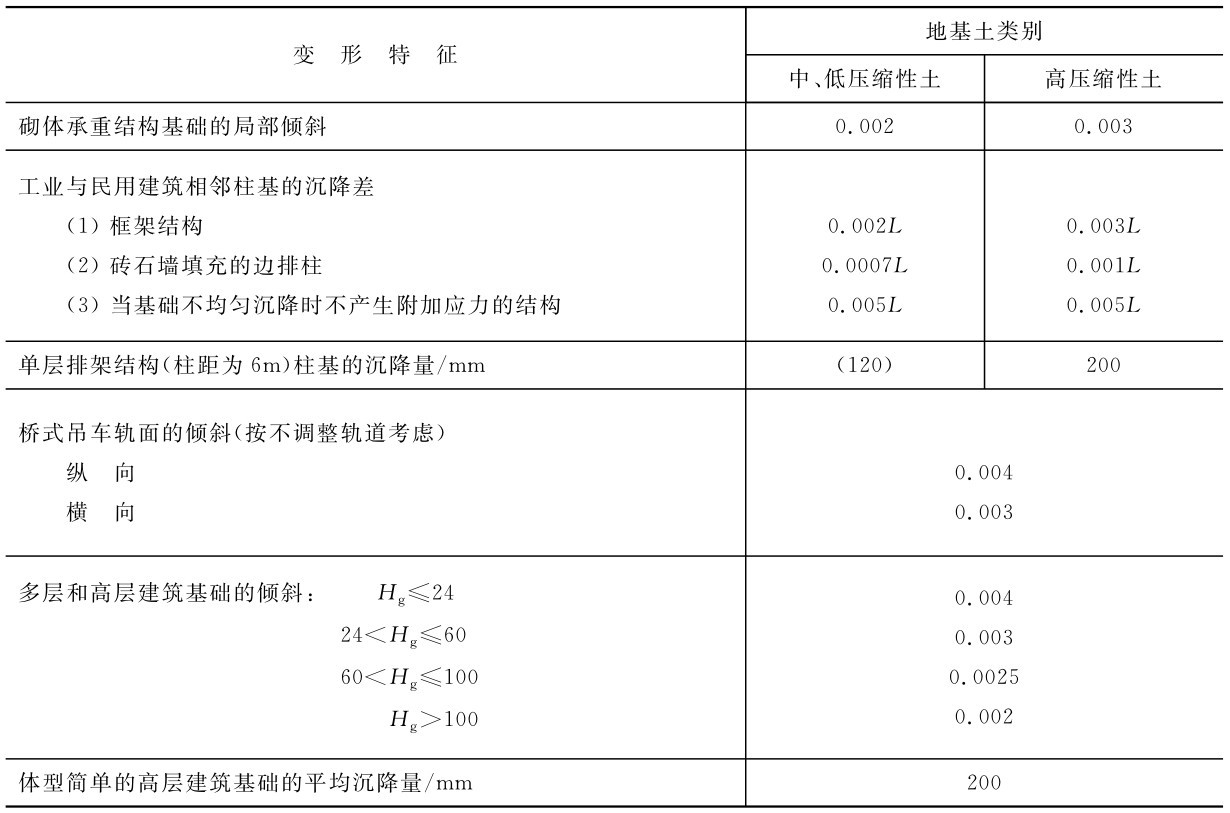在必要的情况下,需要分别预估建筑物在施工期间和使用期间的地基变形值,以便预留建筑物有关部分之间的净空,并考虑连结方法和施工顺序。此时,一般多层建筑物在施工期间完成的沉降量,对于砂土可认为其最终沉降量已完成80%以上,对于低压缩黏性土可认为已完成最终沉降量的50%~80%,对于中压缩性土可认为已完成20%~50%,对于高压缩性土可认为已完成5%~20%。