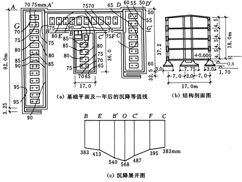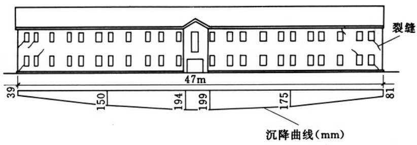 图8-36 “E”形平面建筑物的不均匀沉降