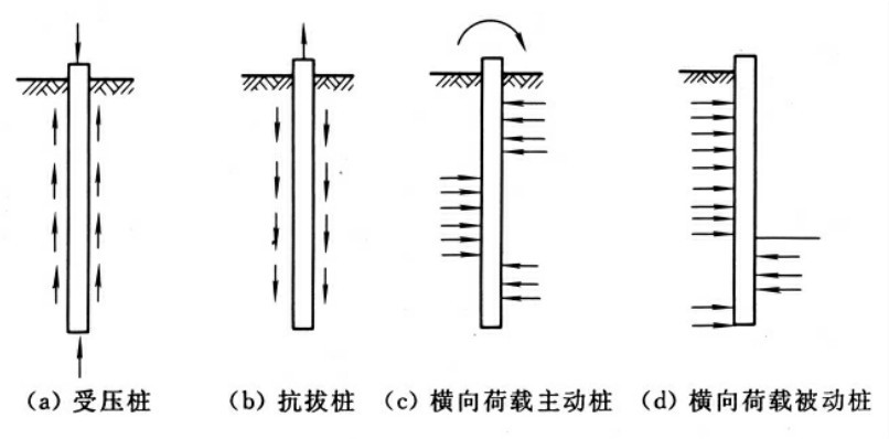 按使用功能可把桩分为竖向抗压桩、竖向抗拔桩、水平受荷桩、复合受荷桩等。