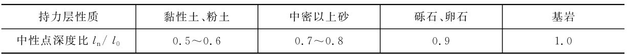 中性点的位置取决于桩与桩侧土的相对位移,与作用荷载和桩周土的性质有关。当桩侧土层压缩变形大,桩底下土层坚硬,桩的下沉量小时,中性点位置就会下移。此外,由于桩侧土层及桩底下土层的性质和作用的荷载不同,其变形速度会不一样,中性点位置随着时间也会有变化。要精确地计算出中性点位置是比较困难的,目前可按表9-1的经验值确定。