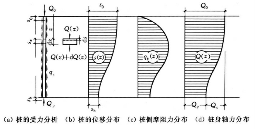 桩顶不受力时,桩静止不动,桩侧、桩端阻力为零,桩顶受力后,桩发生一定的沉降后达到稳定,桩侧、桩端阻力总和与桩顶荷载平衡,随着桩顶荷载的不断增大,桩侧、桩端阻力也相应地增大,当桩顶在某一荷载作用下,出现不停滞下沉时,桩侧、桩端阻力才达到极限值。这说明桩侧、桩端阻力的发挥,需要一定的桩土相对位移,即桩侧、桩端阻力是桩土相对位移的函数。