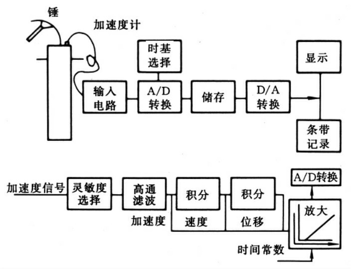 应力波反射法的基本原理是在桩身顶部进行竖向激振,弹性波沿着桩身向下传播,当桩身存在明显波阻抗差异的界面(如桩底、断桩、缩径或扩径等),将产生反射波,检测和分析反射波的到达时间、幅值和波形特征,就可判别桩身的完整性,测试系统如图9-22所示。