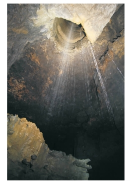 岩溶竖向洞穴景观,洞道垂直或陡角度倾斜的岩溶洞穴景观,地貌学中称之为竖井(图7-32)。由落水洞向下发育或洞穴顶板塌陷而成,通常底部为地下河水面。