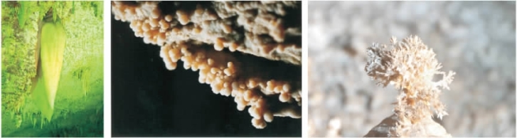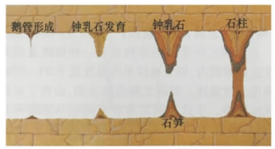 洞穴化学沉积物,在洞穴形成之后,由于化学溶解、重结晶等作用在洞穴内形成的各种地貌形态,如鹅管(图7-34)、钟乳石、石笋、石柱(图7-35),它们的形成示意图如图7-36所示;再比如石幔(图7-37)、石旗(图7-38左图)、石葡萄(图7-38中图)、石花(图7-38右图)等微地貌景观。