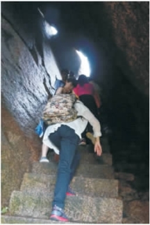 在高温岩浆流动与冷凝过程中,由于其中各种气体的逸出和岩浆冷凝收缩,从而形成一系列复杂的熔岩空洞和熔岩隧道,有时洞体规模巨大,是重要的洞穴旅游景观。如海南省海口石山火山国家地质公园(图7-39)内,有数个巨大的熔岩隧道,其中卧龙洞宽约10m,高约7m,长约3000m,洞壁为光亮的玄武岩;仙人洞洞壁上布满着刺状熔岩,可以看到岩浆流动痕迹,最大的洞室高14.7m,面积达5800m2。黑龙江镜泊湖地质公园、浙江雁荡山地质公园(图7-40)都有熔岩隧道类的旅游项目。