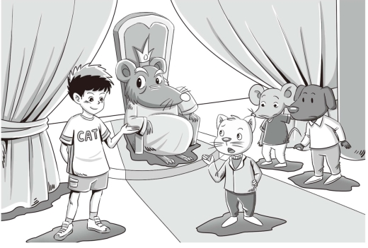 老鼠国王坐在一个形状像鸟窝、里面铺着干苔藓的椅子上,椅子旁边站着秦小旗。老鼠国王面前已经站着三个总理候选人:一只白猫、一只灰老鼠和一条黑狗。