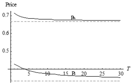 从图3可以看到,价格ph和pl的最优值都随T的增加而减小,并且分别趋近于某一个值。假设γ=0时,给定β*=1,高价的最优解趋近于