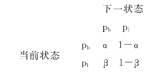 基于马尔科夫链矩阵的价格结构:在电子商务环境中,我们构建一种基于价格随机化的非规律性(随机)动态定价销售策略。在这种销售策略中,价格的变化被定义为一个具有两个状态(ph,pl)的一阶马尔科夫过程。其中高价格ph代表了正常价格,低价格pl代表一个促销价。当价格处于高(低)状态,它仍然保持在该状态μh(μl)个周期,然后零售商决定是否改变价格。价格变化的转移概率矩阵描述如下: