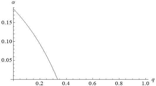 在图5中,我们给出前述当消费者具有两个等待状态的算例中的最优解。可以看到,当q≥1/3时,α*=0。而当q<1/3时,α*在0.186和0之间,并随着q的增加而减小。这表明最优转移概率不是的连续函数。