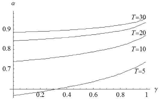 之所以只考虑消费者的等待时间的两个状态,是因为当消费者的耐性程度更高,即当T更大时,很难从高次方程求解α的表达式,但可以通过数值计算,进一步分析T和γ对最优解的影响,从而总结模型更多的管理意义。