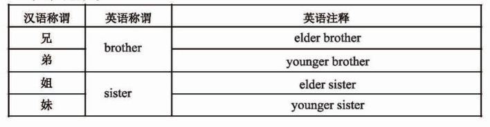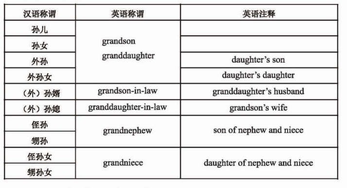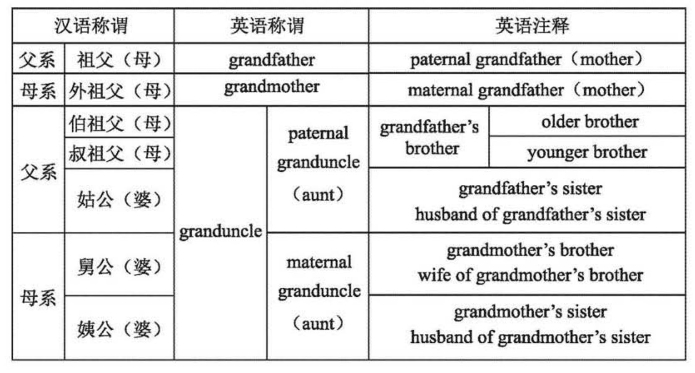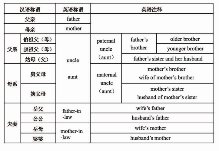 同辈亲属因父系母系不同,亲属称谓也有严格区别,如:侄—甥;姑—姨;伯(或)叔一舅;父—岳父(丈人);母—岳母(丈母娘);堂兄—表兄。英语的亲属称谓不分血亲和姻亲,如nephew、aunt、uncle、cousin皆不分父系或母系亲属。