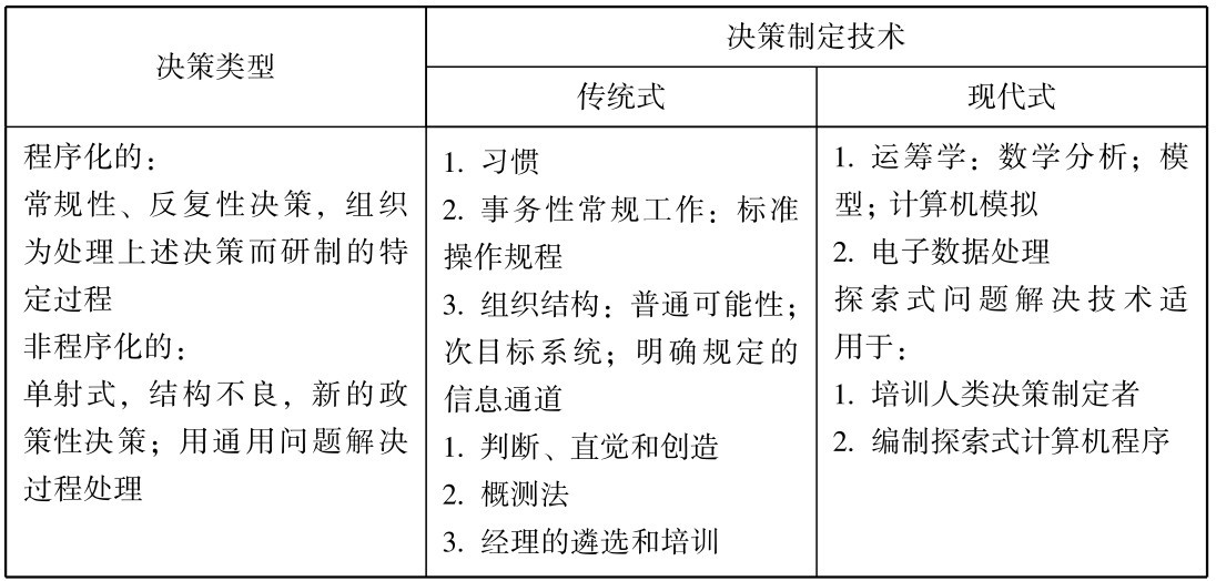 在西蒙那里, 决策时所采用的不同技术是区分程序化决策和非程序化决策的主要依据。 西蒙分别从传统和现代两个方面阐述了程序化决策和非程序化决策的技术。