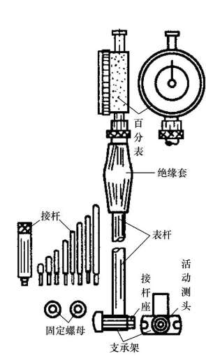 量缸表又称内径百分表,主要用来测量孔的内径,如气缸直径、轴承孔直径等。量缸表主要由百分表、表杆和一套不同长度的接杆等组成,如图2.1.16所示。