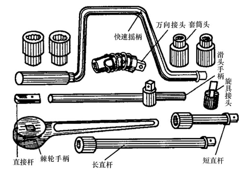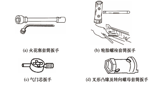 (3)套筒扳手。套筒扳手的材料、环孔形状与梅花扳手相同,适用于拆装位置狭窄或需要一定扭矩的螺栓或螺母,如图2.1.3所示。套筒扳手主要由套筒头、万向接头滑头手柄、棘轮手柄、快速摇柄、滑头手柄、接头和接杆等组成,各种手柄适用于各种不同的场合,以操作方便或提高效率为原则。常用套筒扳手的规格是10~32mm。在汽车维修中还采用了许多专用套筒扳手,如火花塞套筒扳手、轮胎螺栓套筒扳手、气门芯扳手、叉形凸像及转向螺母套筒扳手等,如图2.1.4所示。