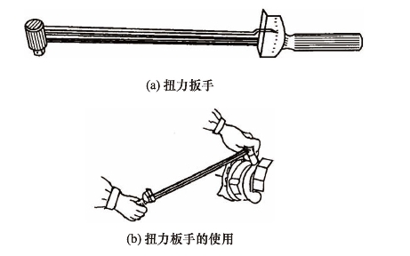 (5)扭力扳手。扭力扳手是一种可读出所施扭矩大小的常用工具,如图2.1.6所示。其规格是以最大可测扭矩来划分的,常用的有294N·m、490N·m两种。扭力扳手除用来控制螺纹件旋紧力矩外,还可以用来测量旋转件的起动转矩,以检查配合、装配情况。