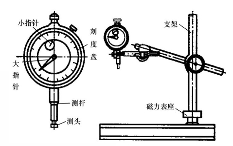 百分表主要用于测量零件的形状误差(如曲轴弯曲变形量、轴颈或孔的圆度误差等)或配合间隙(如曲轴轴向间隙)。常见百分表有0~3mm、0~5mm和0~10mm三种规格。百分表的刻度盘一般为10格,大指针转动一格表示0.01mm,转动一圈为1mm,小指针可指示大指针转过的圈数。
