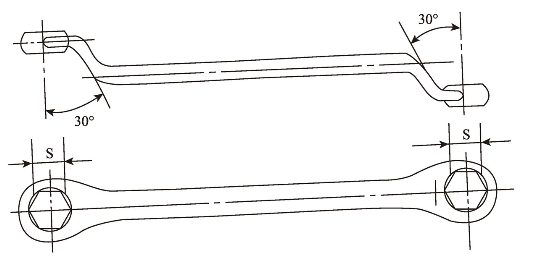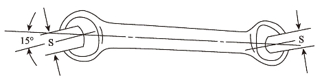 (1)开口扳手。开口扳手是最常见的一种扳手,又称呆扳手,如图2.1.1所示。其开口的中心平面和本体中心平面约成15°角,这样既能适应人手的操作方向,又可降低对操作空间的要求。开口扳手用45号、50号钢锻造,并经热处理。其规格是以两端开口的宽度S(mm)来表示的,如8~10、12~14等。开口扳手通常是成套装备,有八件一套、十件一套等。