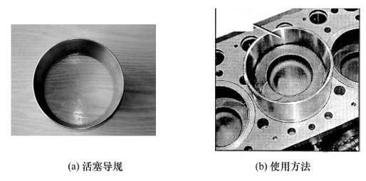 安装活塞连杆总成时,将活塞导规套入活塞外圈并压缩活塞环,将总成套入缸孔,如图2.1.22所示。注意:装配时,先将活塞外圆及活塞环涂油,再小心套入。