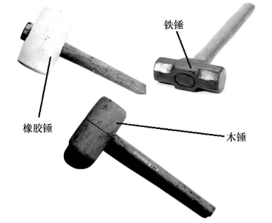 汽车维修中常用的锤子有铁锤、木锤和橡胶锤,如图2.1.10所示。铁锤通常用工具钢制成,规格按锤头质量划分。使用时应使锤头安装牢靠,手握锤柄末端,用锤头正面击打物体。木锤和橡胶锤主要用于击打零件加工表面,以保护零件不被损坏。
