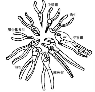 钳子的基本功能是用来弯曲或安装小零件,剪断导线或螺栓等。钳子有很多类型和规格,如图2.1.9所示。
