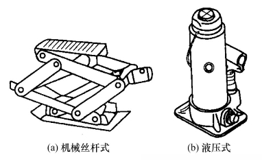 千斤顶是一种最常用、最简单的起重工具,按照其工作原理可分为机械丝杆式和液压式,如图2.1.21所示。通常工作中使用的有螺旋千斤项、液压千斤顶和液压举升器。液压千斤顶用于举升汽车及其他重物。汽车常用液压千斤顶的举升力为3t、5t、8t等。液压千斤顶的结构由顶块、螺旋杆、贮油筒、油缸、摇动手柄、压油柱塞、柱塞筒、进出油阀、油阀、螺塞和壳体等组成。