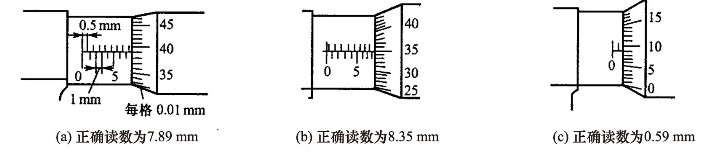 外径千分尺的读数方法如图2.1.14所示。外径千分尺固定套管上有两组刻线,两组刻线之间的横线为基线,基线以下为毫米刻线,基线以上为半毫米刻线;活动套管上沿圆周方向有50条刻线,每一条刻线表示0.01mm。读数时,固定套管上的读数与0.01倍的活动套管读数之和即为测量的尺寸。