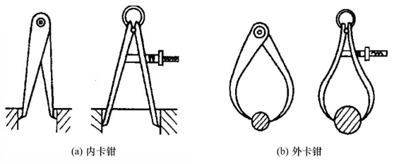 卡钳是一种间接读数的量具,卡钳上不能直接读出尺寸,必须与钢板尺或其他刻线量具配合测量。常用卡钳类型如图2.1.11所示,内卡钳用来测量内径、凹槽等,外卡钳用来测量外径和平行面等。