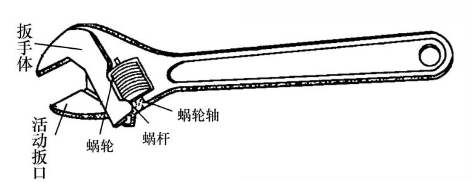 (4)活动扳手。活动扳手开口尺寸能在一定的范围内任意调整,使用场合与开口扳手相同,但活动扳手操作起来不太灵活,如图2.1.5所示。活动扳手的规格是以最大开口宽度S(mm)来表示的,常用的有150mm、300mm等,材料上通常是由碳素钢或铬钢制成的。