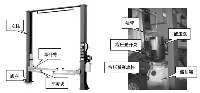 龙门式举升机的结构如图2.2.1所示,主要由底座、立柱、举升臂、平衡块、油管、储油罐、液压泵、液压泵开关和液压泵释放杆等组成。
