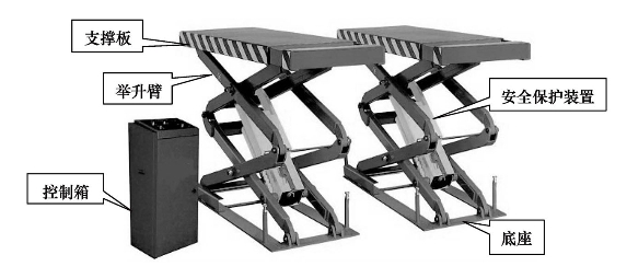 剪式举升机的结构如图2.2.2所示,主要由底座、举升臂、安全保护装置、支撑板和控制箱等组成。