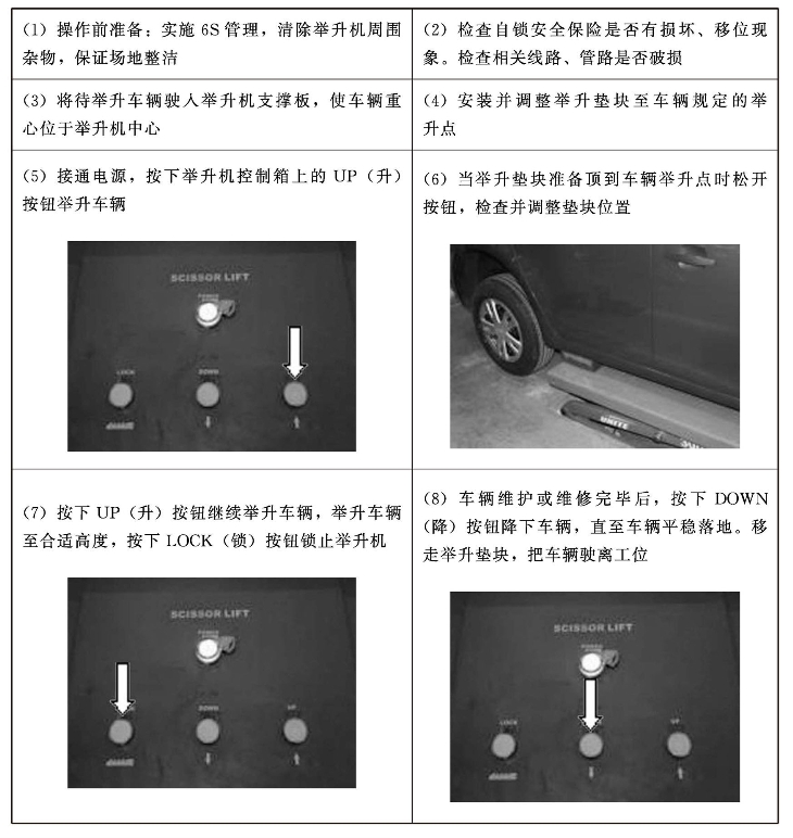 二、剪式举升机的操作步骤,如表2.2.2所示。
