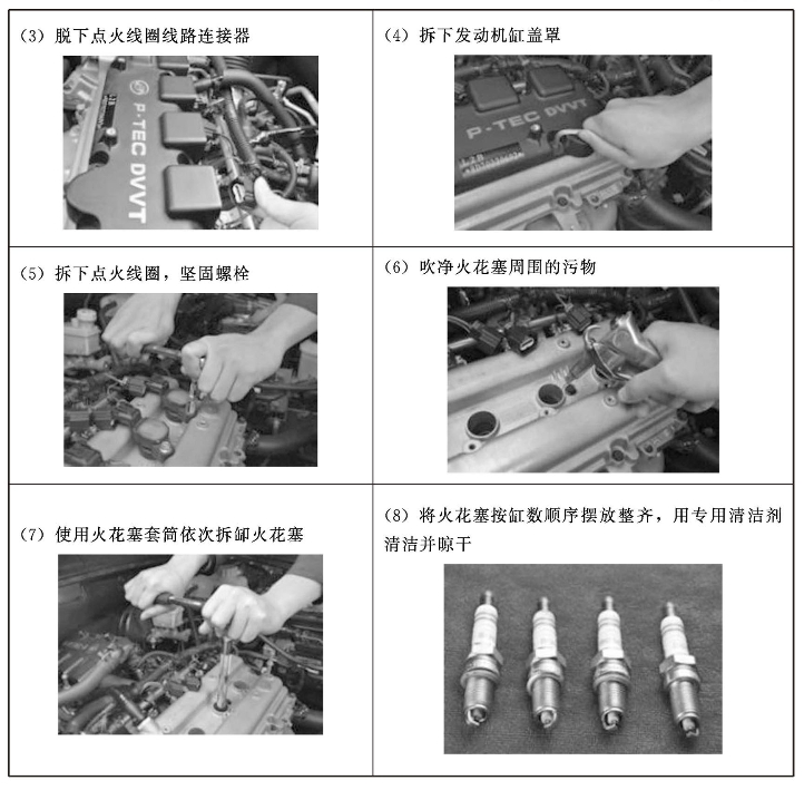 脱下点火线圈线路接插件——拆下点火线圈——使用火花塞套筒依次拆卸火花塞