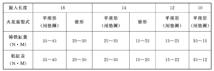(5)应按要求力矩拧紧,过松会造成漏气,过紧会使密封垫失去弹性,同样会造成漏气。锥座型火花塞由于不用密封垫,遵守拧紧力矩尤显重要。火花塞安装拧紧力矩如表3.4.1所示。